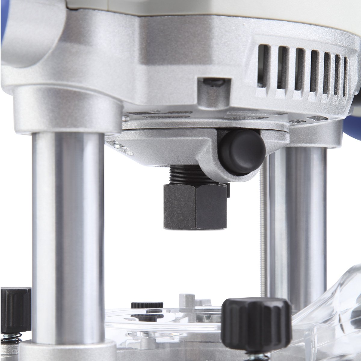 Шпиндель поддерживает частоту вращения в диапазоне 8 000–21 000 об/мин. Цанговый зажим рассчитан на фрезы с хвостовиком до 12 мм, в комплекте предусмотрен переходник на 8 мм. Конструкция обеспечивает надёжную фиксацию оснастки и стабильность при работе с фрезами диаметром до 70 мм.