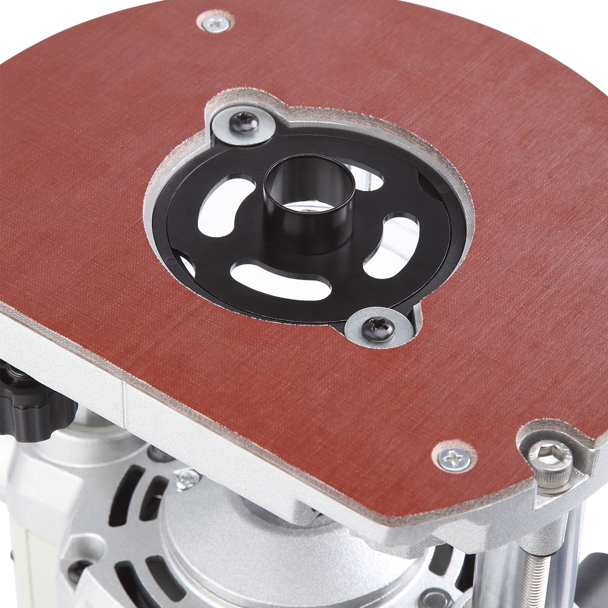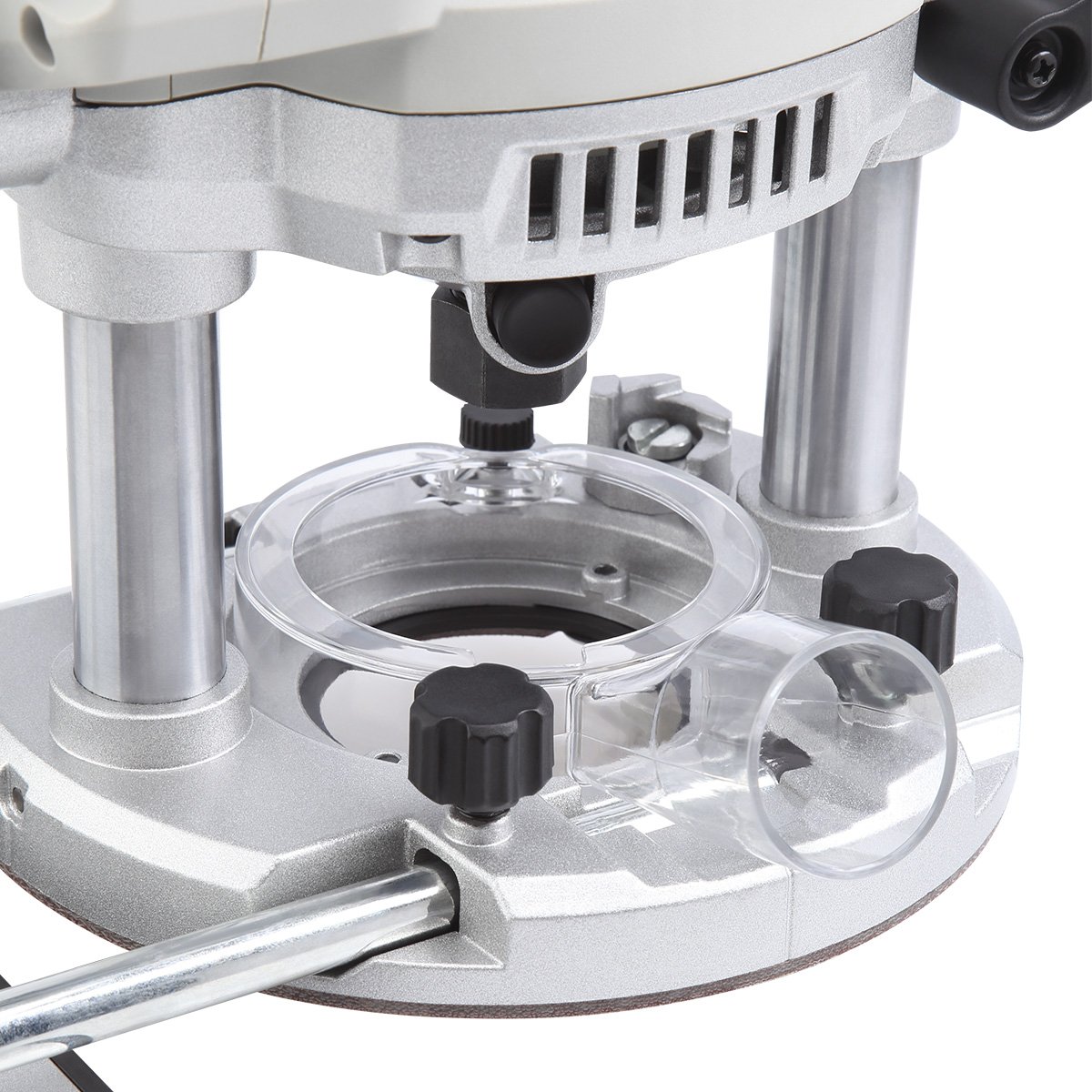 Жесткая опорная пластина из стеклотекстолитового листа обеспечивает устойчивость инструмента, точное позиционирование оси шпинделя и минимальные вибрации при работе. Для точной фасонной резки и фрезерования на фиксированном расстоянии от кромки заготовки предусмотрена направляющая пластина.