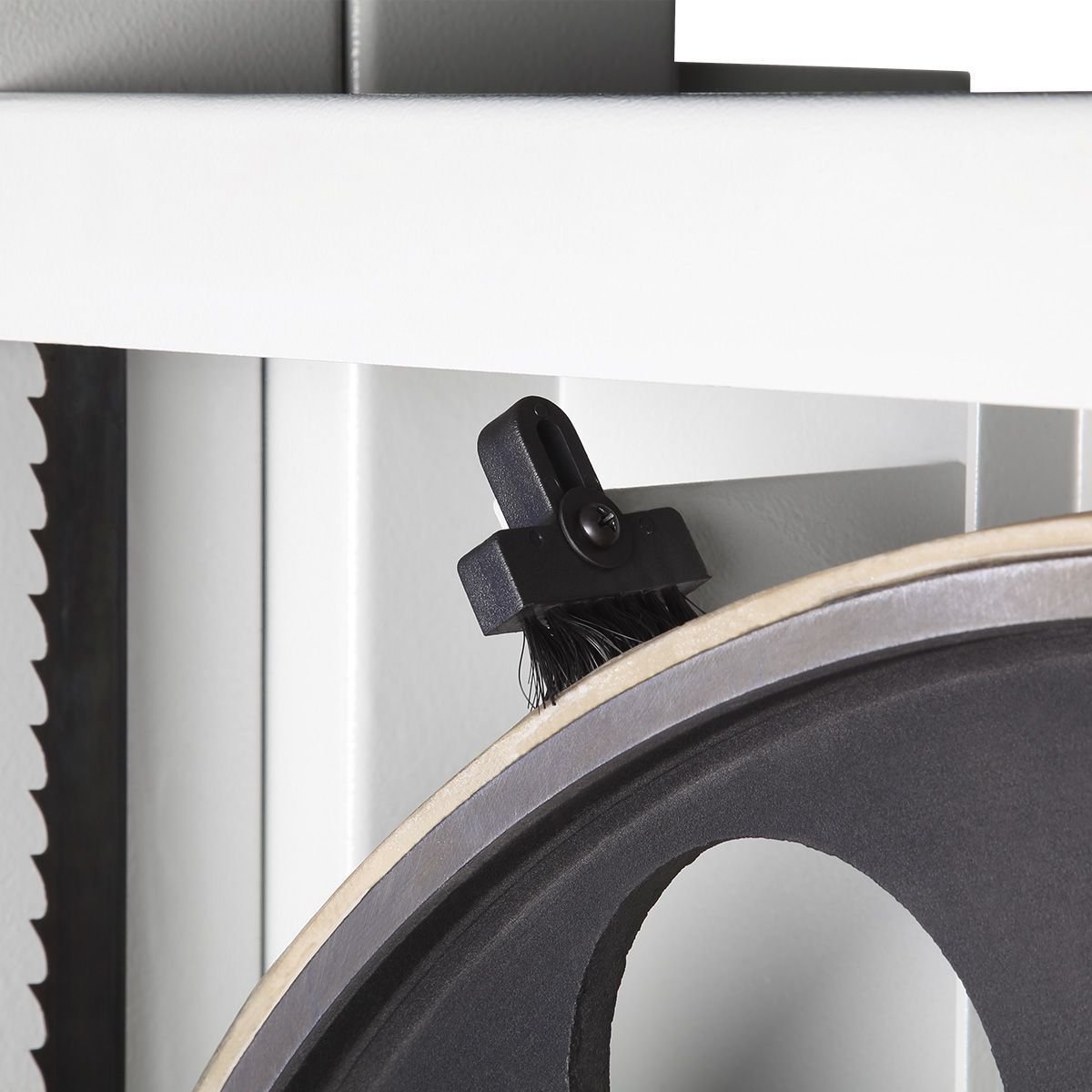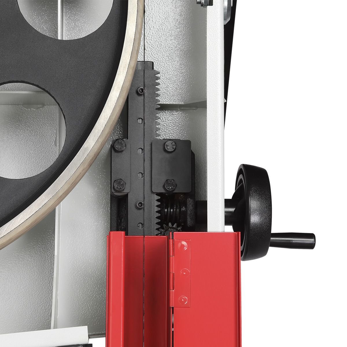 Качество и безопасность реза обеспечивает продуманная система направляющих пильного полотна. Верхний узел с маховиком быстро регулируется по высоте. Боковые опоры и задняя направляющая точно настраиваются для минимального зазора и исключения увода полотна. Натяжение контролируется по индикатору в смотровом окне.