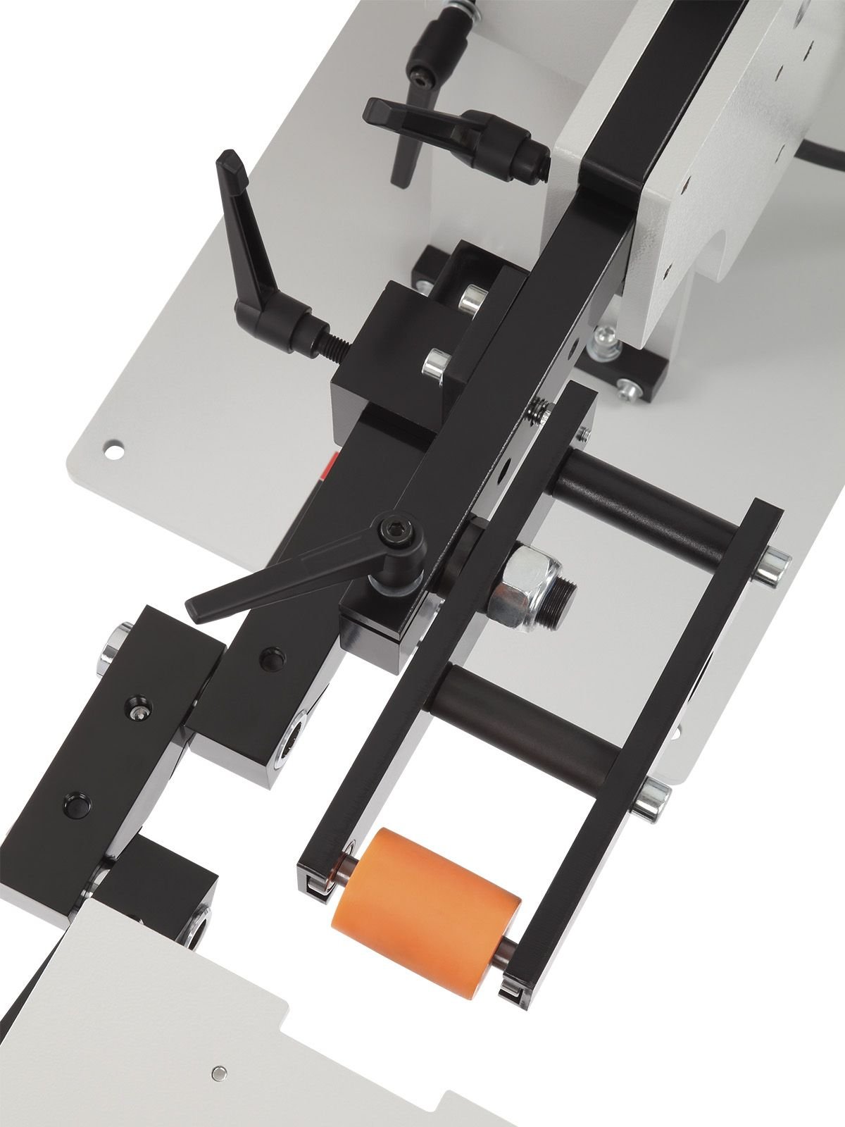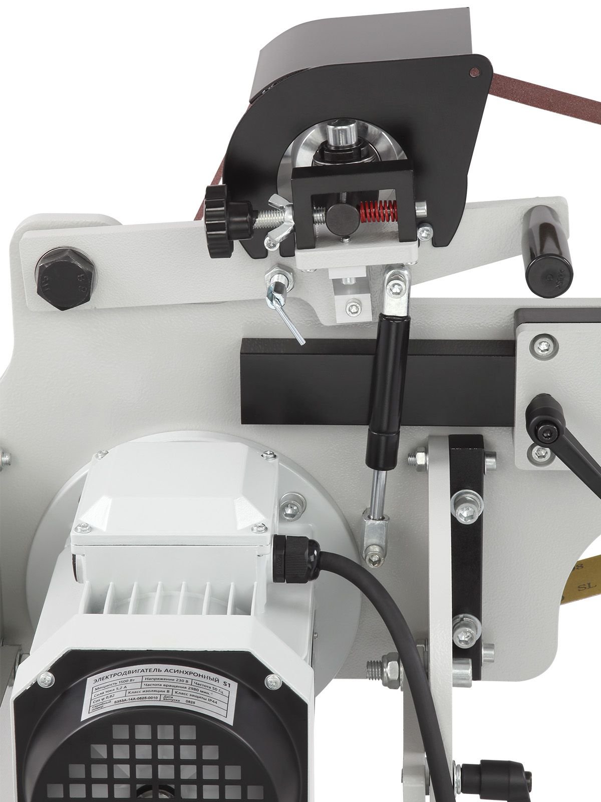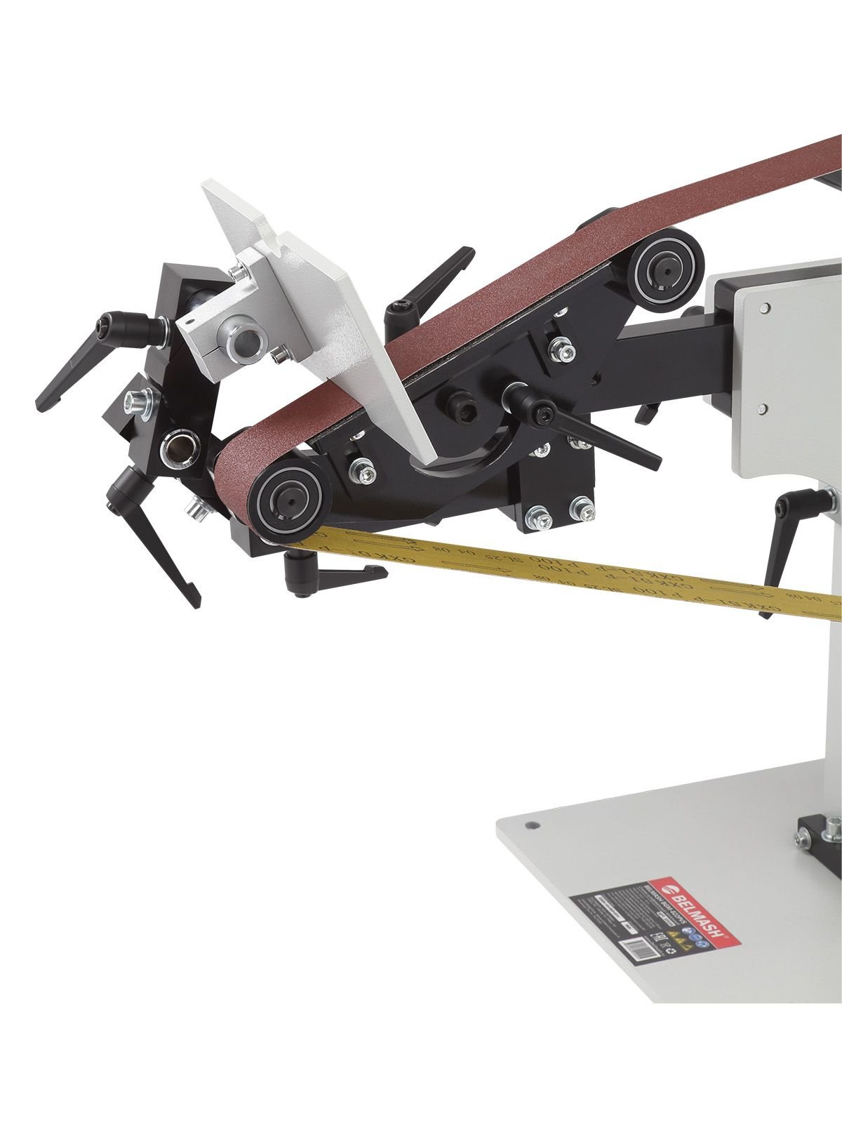 Механизм натяжения ленты оснащен регулировочным роликом. Это позволяет корректировать положение ленты. Длину направляющей можно настраивать, что дает возможность устанавливать ленты разной длины. Для безопасности оператора предусмотрен защитный кожух.